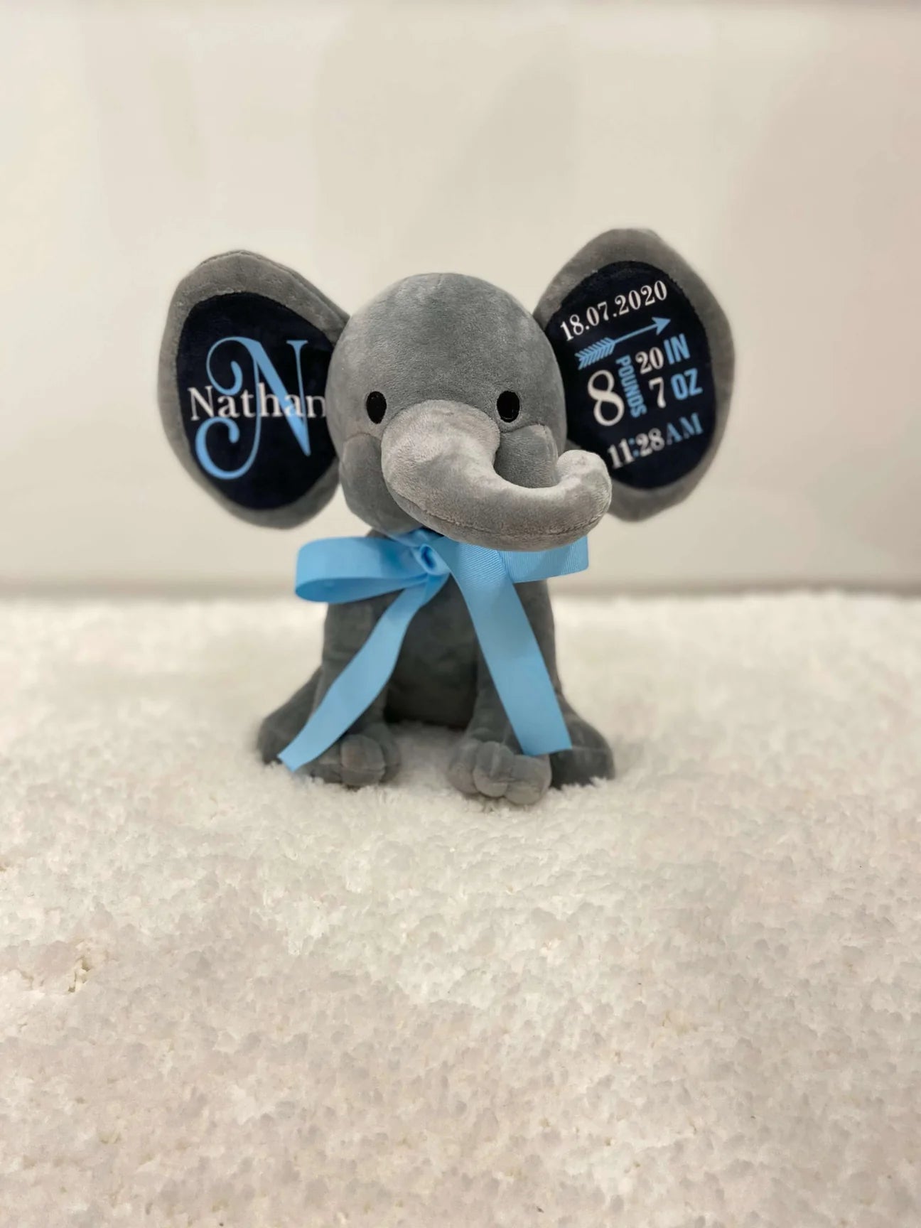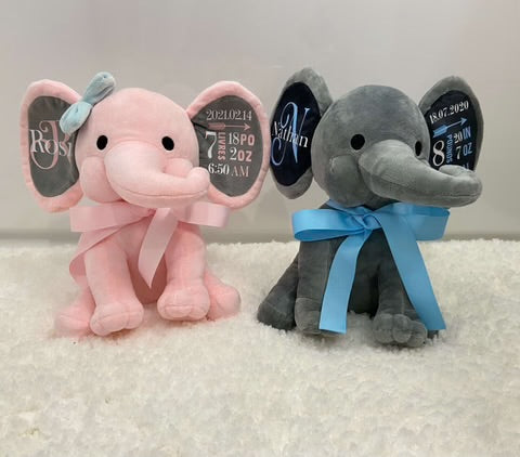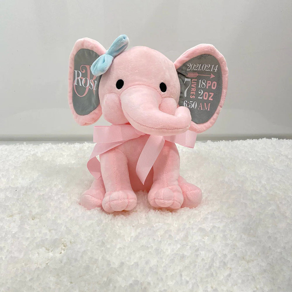Éléphant en peluche personnalisé aux couleurs de votre choix! Un magnifique souvenir de naissance à offrir ou à s’offrir.